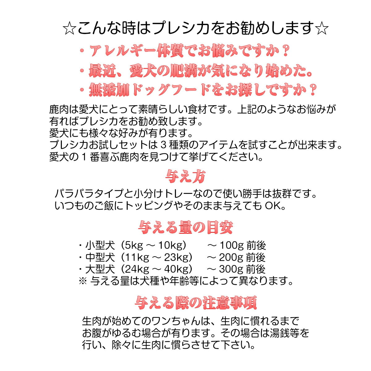 【送料無料】【お試し鹿肉ドッグフード】プレシカ 小分けタイプ【パラパラミンチ200g*1袋・ロースぶつ切り約42g*6個・モモ肉ぶつ切り約42g*6個】【無添加 アレルギー対応 シニア犬対応 鹿肉ドッグフード エゾシカ 赤身 生食 生肉 国産 ダイエット 犬 用 鹿肉 冷凍 】