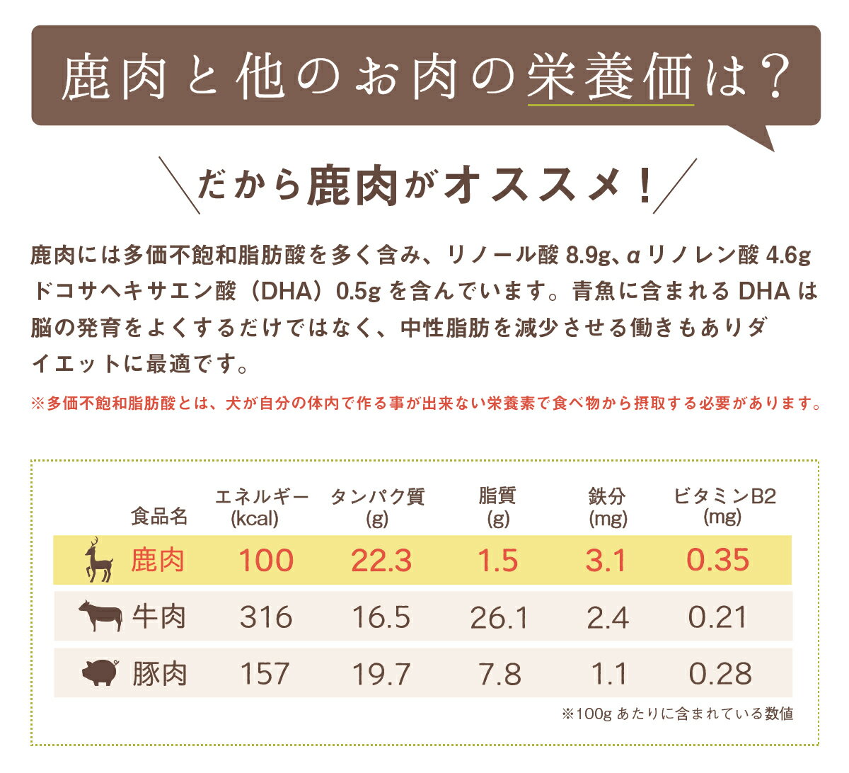 鹿肉の特徴鹿肉は高タンパク、低脂肪、低カロリーで、中性脂肪の減少に効果があり、鉄分は特に多いお肉となっております。